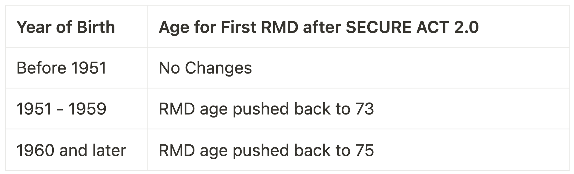 For many years retirees had to take RMDs beginning at age 70½. In 2023, Congress passed legislation known as the SECURE ACT that increased RMD ages to reflect that people are living and working longer. While I’m glad the IRS is no longer using a “½” age, they did keep it from being easy by having different RMD ages based on your year of birth:
